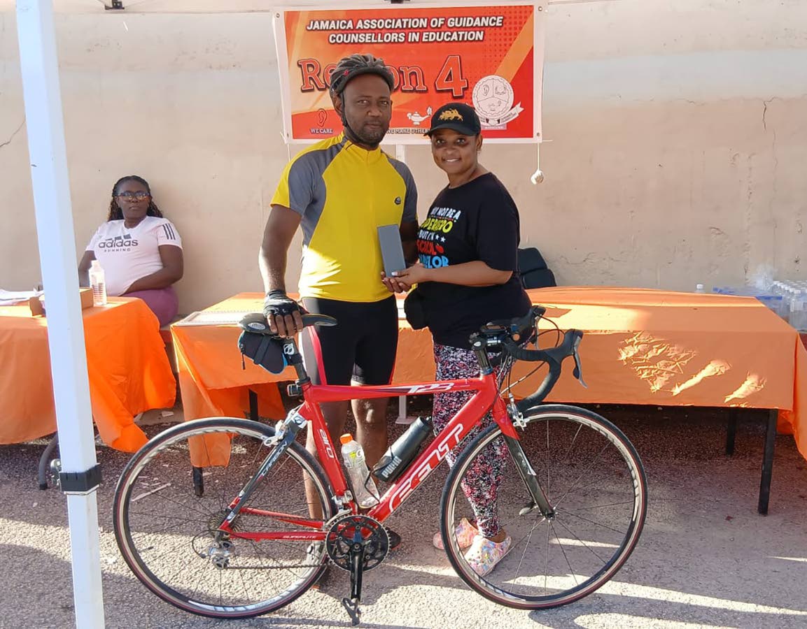 Cyclist Stephen Mahoney (left) receiving a gift from JAGCE Region 4 Immediate Past President Trecia Watkins, for volunteering in the JAGCE Region 4 5k Run/Walk that was staged on October 19. (Photo: Rosalee Wood Condell)