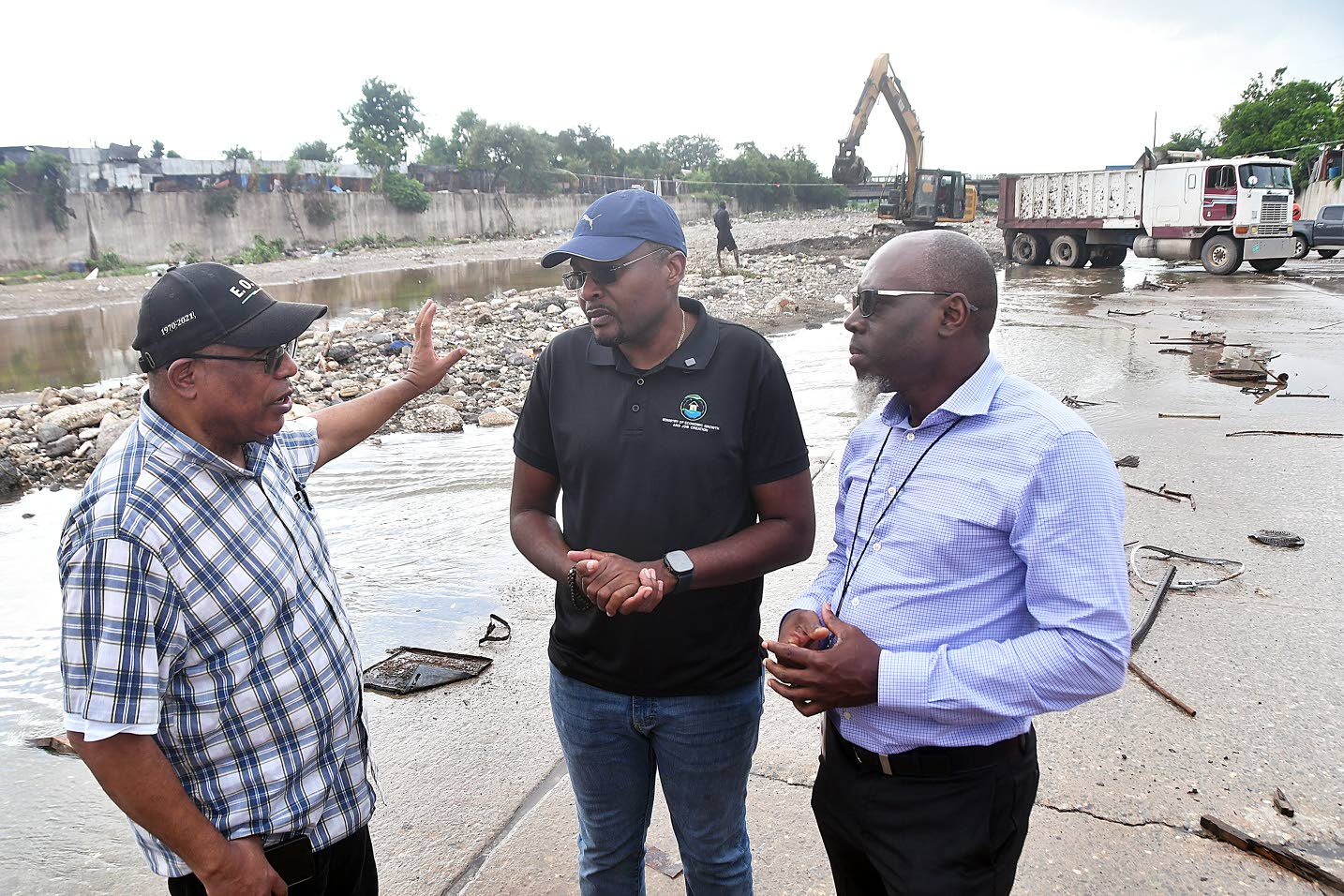 Member of Parliament for St Andrew Western Anthony Hylton (left) speaking with minister without portfolio in the Ministry of Economic Growth and Infrastructure Development with responsibility for works Robert Morgan (centre); and Stephen Shaw, manager of communication and customer services at NWA, as they tour the Sandy Gully on Wednesday. (Photo: Garfield Robinson)
