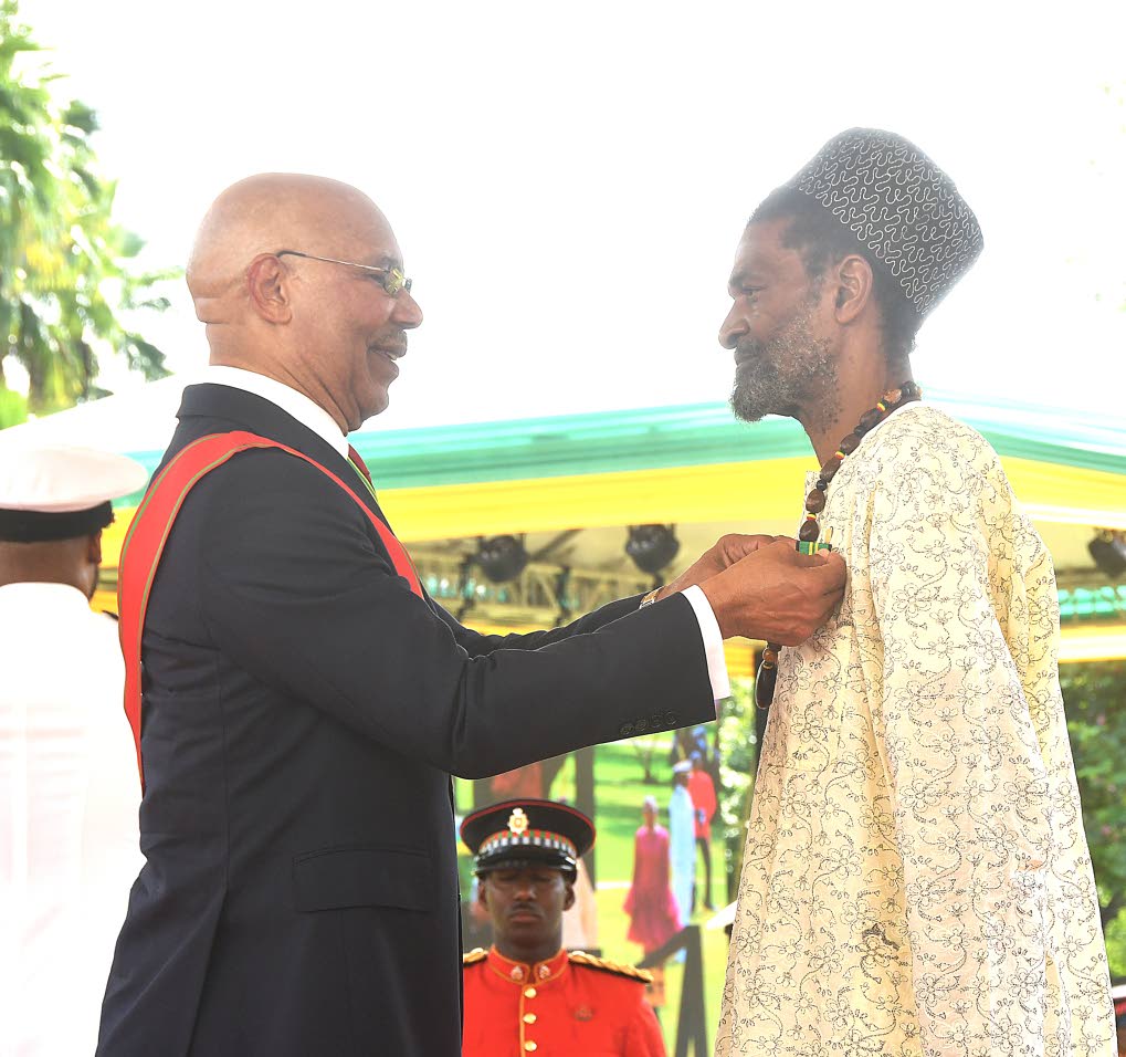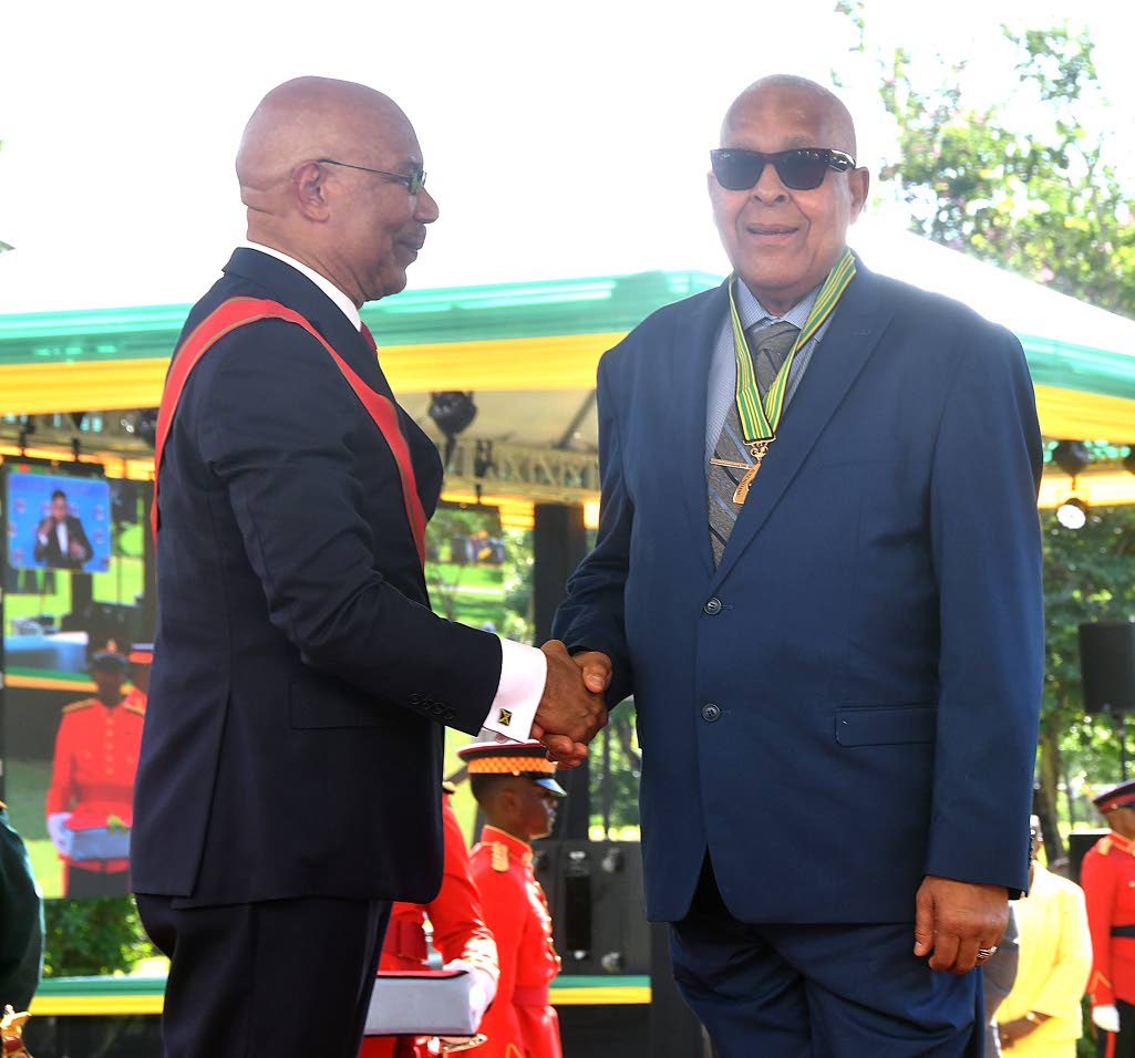 Hilbert Leonard Grant (right), a stalwart of the British reggae scene, receives the Badge of Honour for Meritorious Service from Sir Patrick. (Photo: Naphtali Junior)