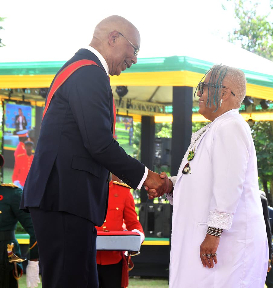 L’Antoinette Stines shakes hands with Governor General Sir Patrick Allen after being pinned with the Order of Distinction insignia on National Heroes’ Day.(Photo: Garfield Robinson)