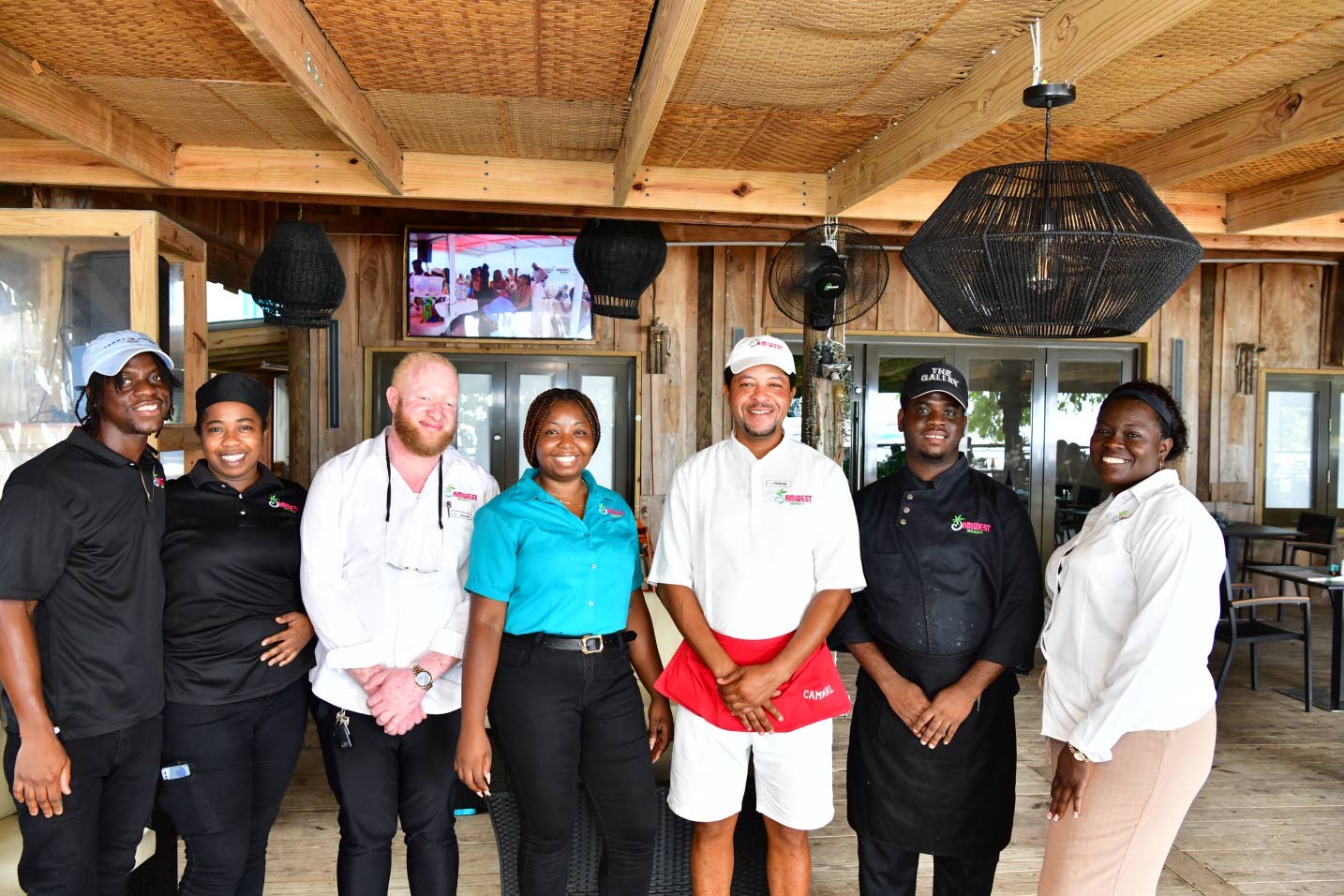 Jamwest Beach staff (from left) Malcolm Grey, café chef; Keisha White, kitchen supervisor; Derris Hogg, support manager; Tashesha White, marketing and events coordinator; Feron Kelly, server; Jermain Jarrett, café chef; and Deandra Hill, restaurant manager (Photo: Aceion Cunningham)
