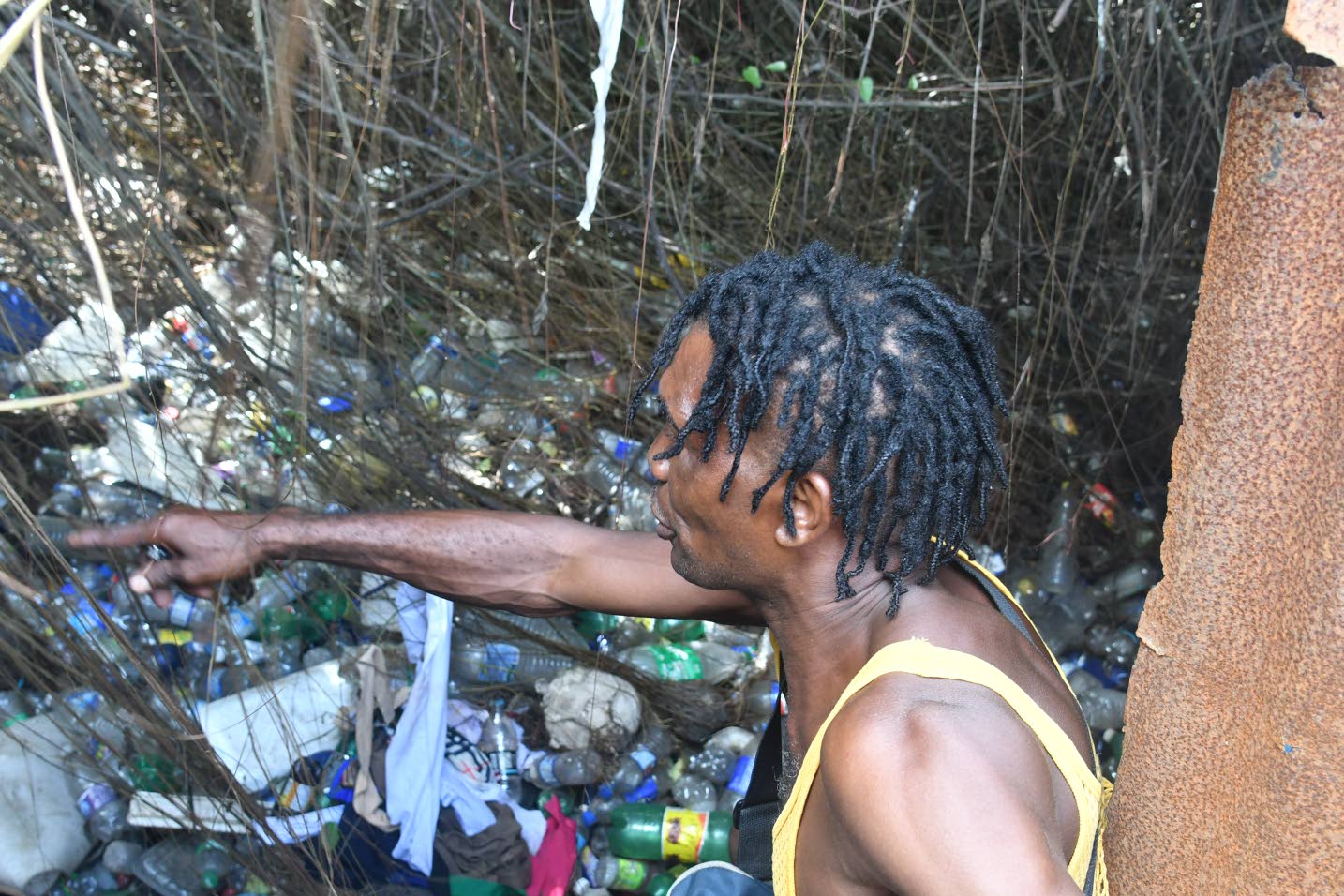 New Haven resident Noel points to bottles that block the free flow of a river that runs alongside the community.