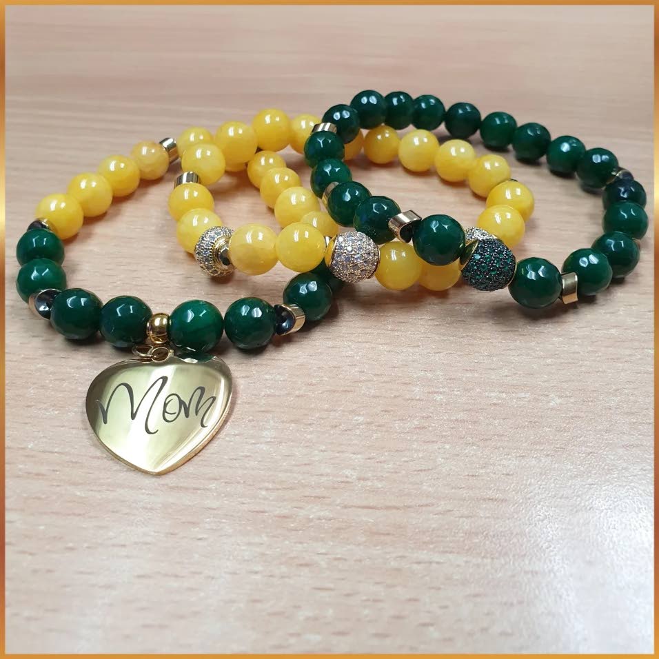 This cheerful “Mom” bracelet duo pairs deep green and yellow gemstones for a timeless keepsake from The Stoic Wear.