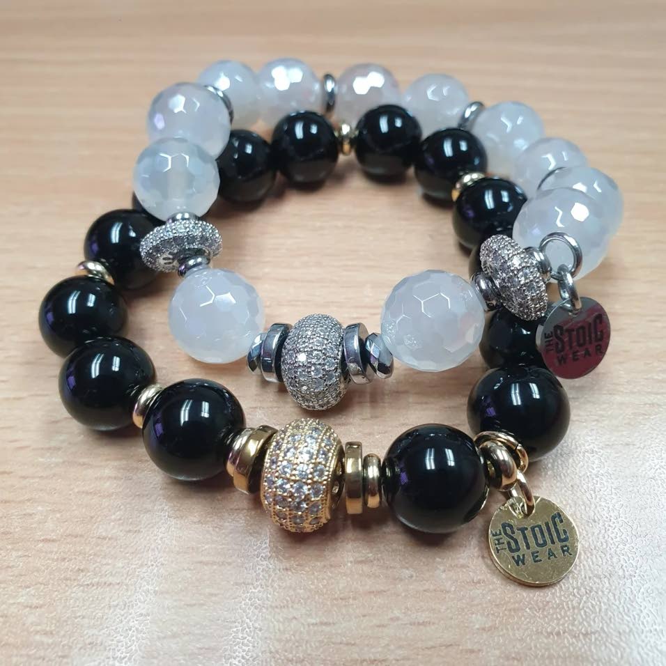 Black and white gemstone bracelets accented with gold and crystal spacers, handcrafted by The Stoic Wear.