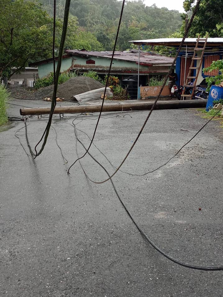 This downed utility pole demonstrates early damage from rain and wind associated with Hurricane Melissa in the community of Wilmington, St Thomas on Saturday.