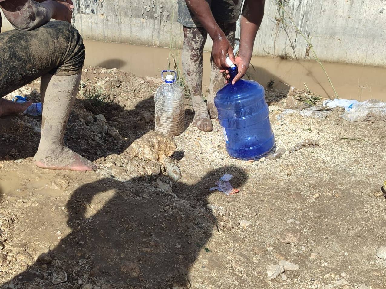 Inside the community a pipe was found that offered a little of the precious resource, and several residents lined up to fill bottles, wash food items, and clean themselves of the mud.