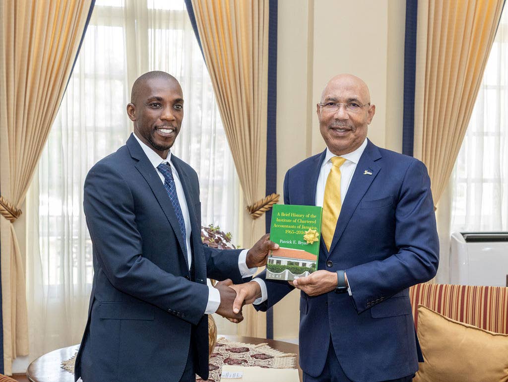 ICAJ Immediate Past President Eric Scott (left) presents Governor General Sir Patrick Allen with a copy of A Brief History of the Institute of Chartered Accountants of Jamaica (1963–2016).