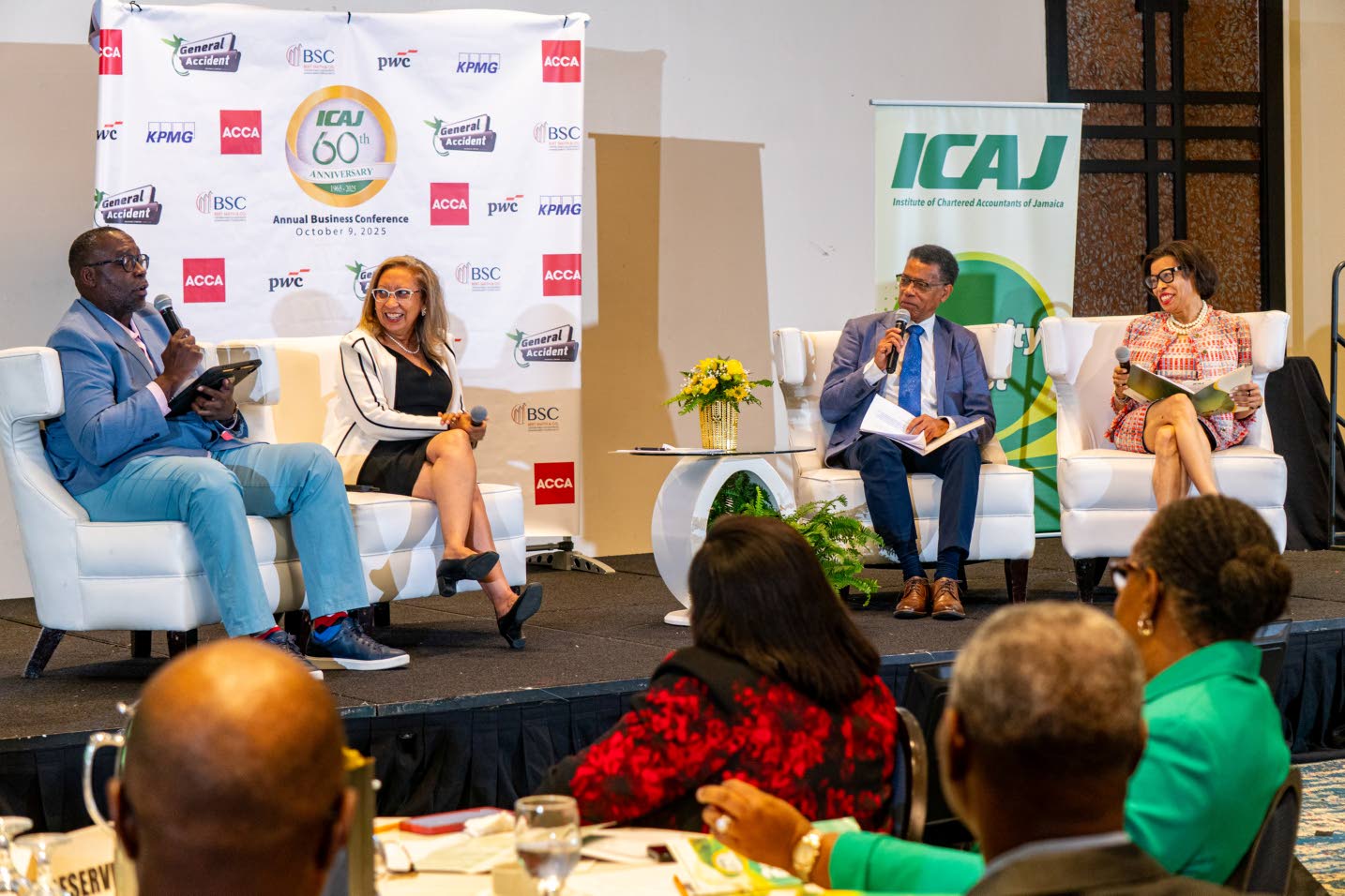 From left: Moderator Garfield Reece, chairman of the Accounting Standards Committee, ICAJ, speaking with panellists Camille Facey, managing partner, FaceyLaw; Dr Archibald Campbell, ICAJ past president and chairman of JMMB Group Limited; and Allison Peart, ICAJ past president and managing director of A Peart Advisory Services, during the ICAJ’s 2025 Business Conference..