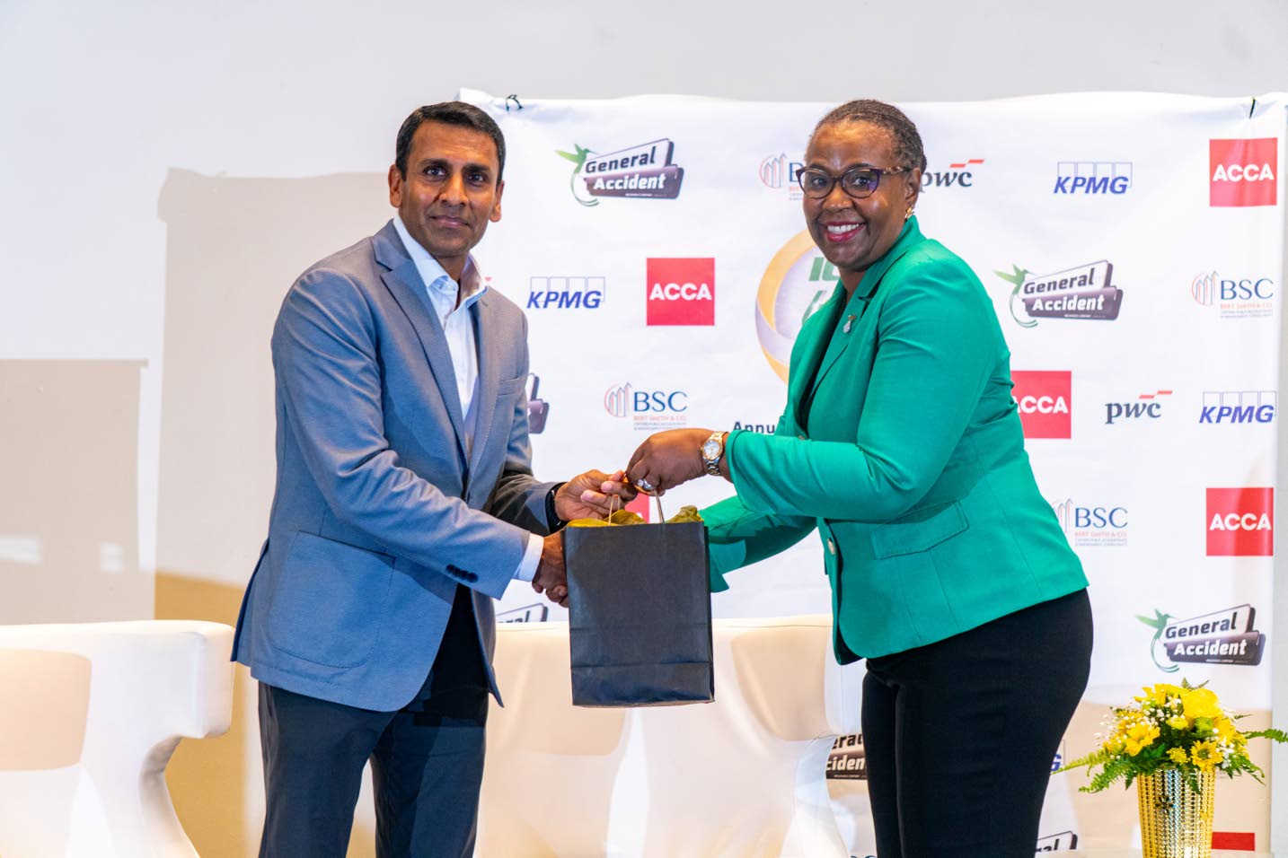 Sharon Harvey Wilson , council member of the ICAJ and chair of ICAJ’s Public Relations and Marketing Committee, presents a gift basket to Alok Jain, chairman, Port Authority of Jamaica, for his informative presentation on the topic ‘Tariffs and the impact on Global Trade’..