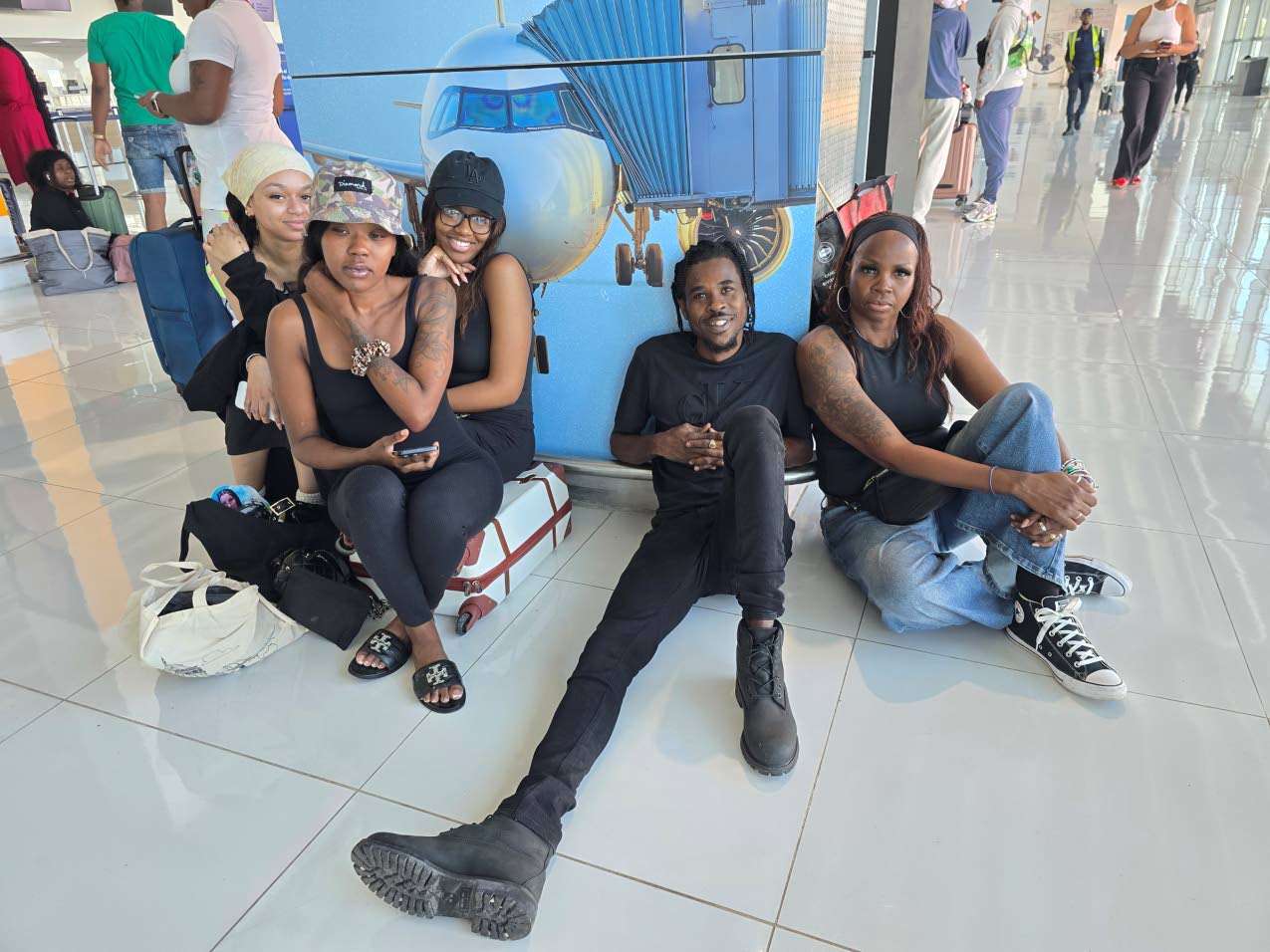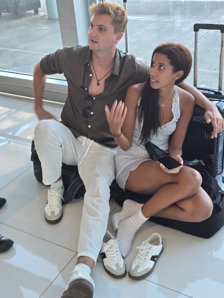 Tourists Jasper Humphries (left) and Khadija Himed at Norman Manley International Airport on Tuesday await their flight to the Cayman Islands. (Photo: Karl Mclarty)