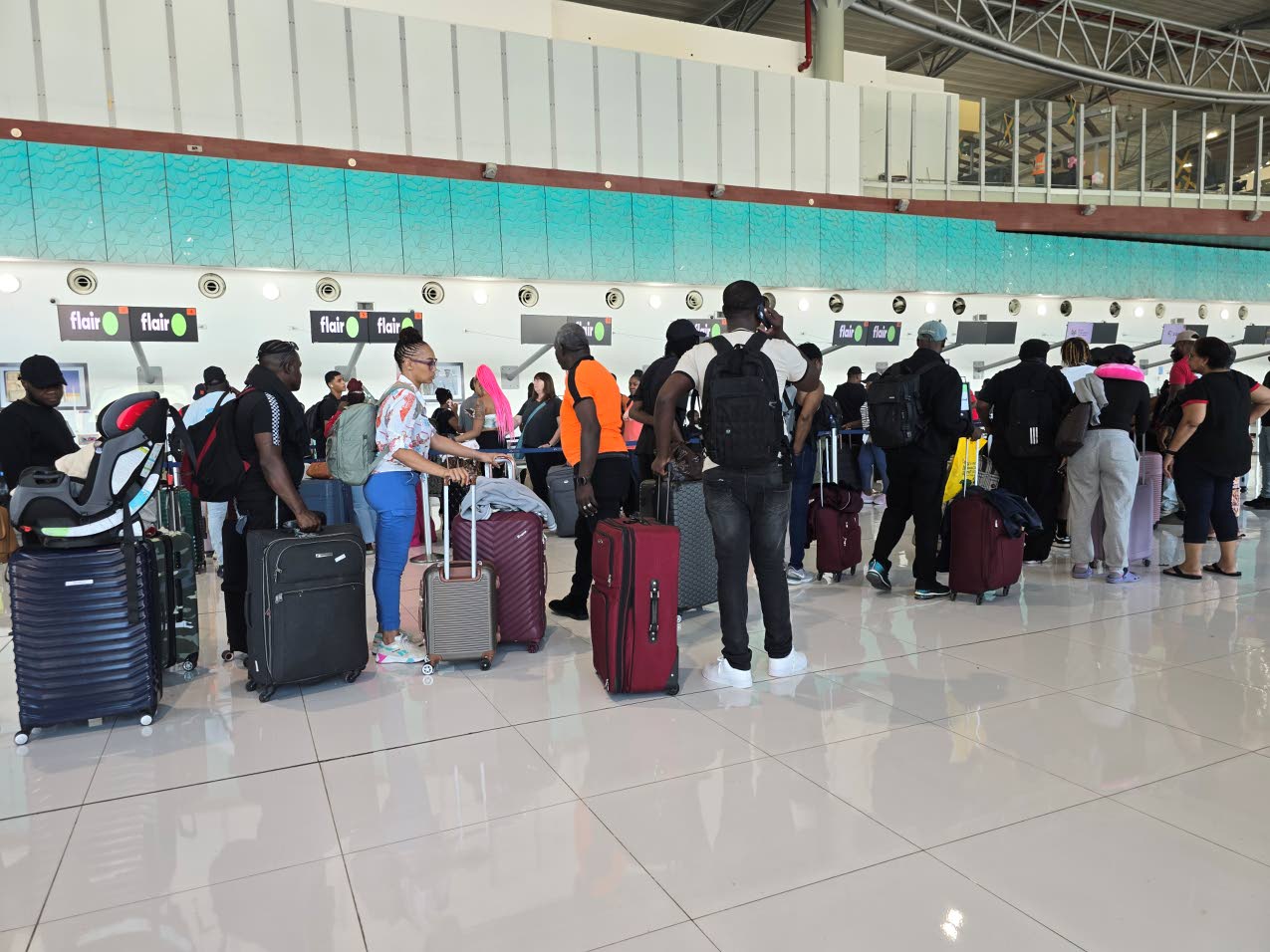 Long line of tourists and visitors at Norman Manley International Airport waiting to book their flights as they set to leave Jamaica on Thursday following the passage of Hurricane Melissa. (Photo: Karl Mclarty)