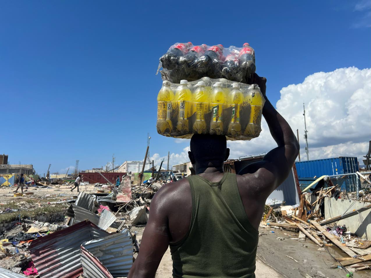 With two cases of soft drinks secured, this man makes his way home in Black River, St Elizabeth, last Thursday.