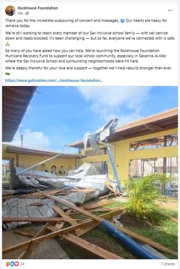 Days after the passage of Hurricane Melissa in Jamaica on Tuesday, October 28, the Rockhouse Foundation launched a Hurricane Recovery Fund to support the local school community, especially in Savanna-la-Mar, where the Sav Inclusive School and surrounding neighbourhoods were hit hard.facebook.com/rockhousefoundation/