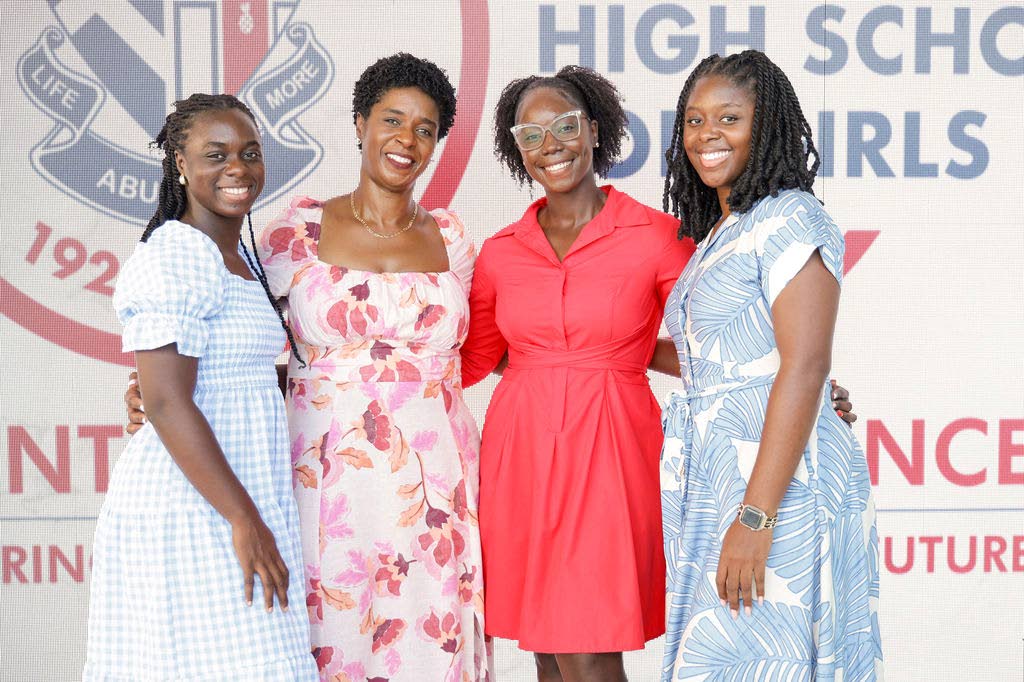 Generational abundance: Dr Tamika Benjamin, assistant chief education officer at the Ministry of Education, Skills, Youth and Information and former SAHS Head Girl (second left), shares a proud moment with her three daughters — also SAHS alumnae — at the institution’s centenary commemoration service. Pictured (from left): Naomi Silvera, Elizabeth Benjamin, and Raechel Benjamin..