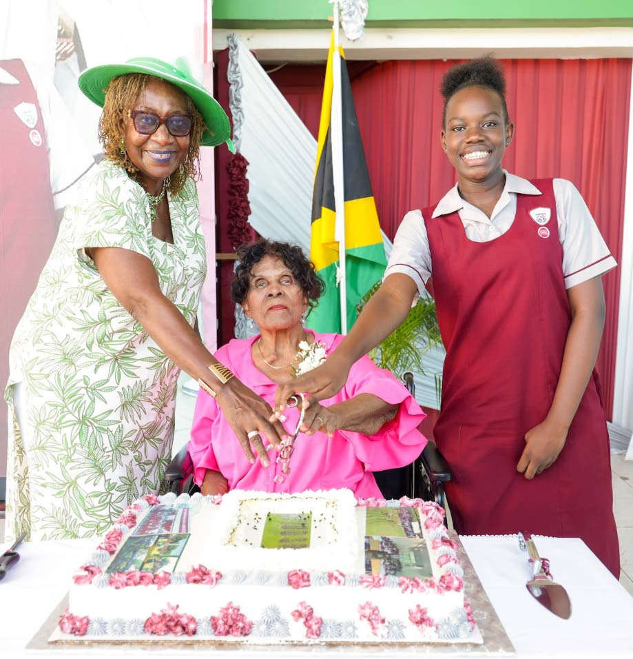 St Andrew High School for Girls marked its centenary legacy with a symbolic cake-cutting ceremony at the commemoration service. Pictured (from left): Norma L Walters, patron and custos rotulorum emerita of St Ann; Hermenia Burke-Robertson, the school’s oldest living alumna; and Zenovia Lawrence, the youngest current student of SAHS..