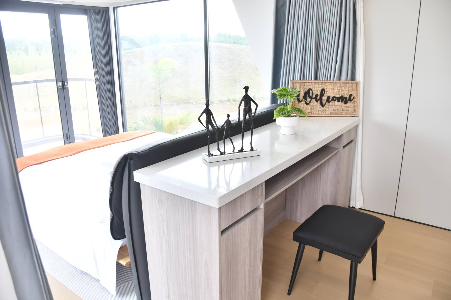 The S5, a one-bedroom unit of about 300 square feet, feels warm and intimate. It opens onto a small patio framed by floor-to-ceiling glass, with an airy bedroom that flows into a minimalist living space. Smart-home technology controls air conditioning, projection screens, and lighting, giving owners fingertip command over every feature.