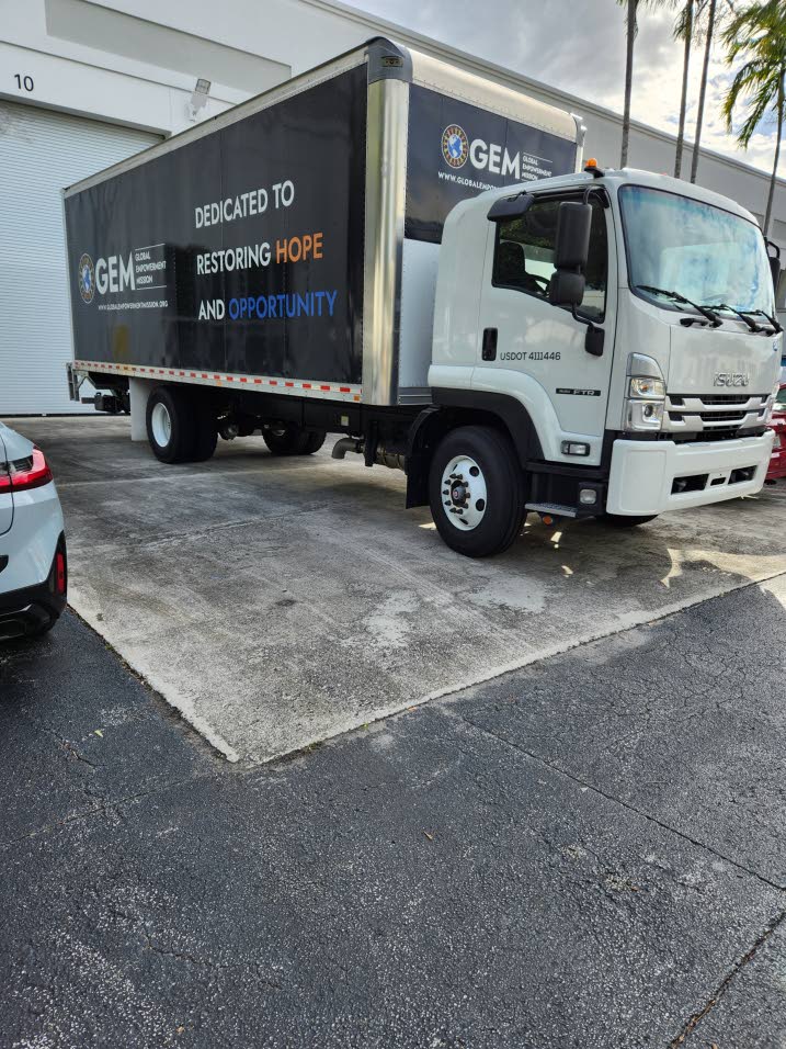 A Global Empowerment Mission truck in Doral, Florida, packed and ready to take food packages for a flight to Jamaica.
