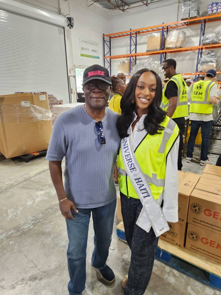 Miss Universe Haiti Melissa Sapini jokes with Desmond Allen, founding editor of the Jamaica Observer about changing her name from Melissa, the name of the hurricane which devastated their two countries last week. Sapini and Allen were among volunteers who assisted in preparing food packages destined for hurricane victims in impacted Caribbean islands.