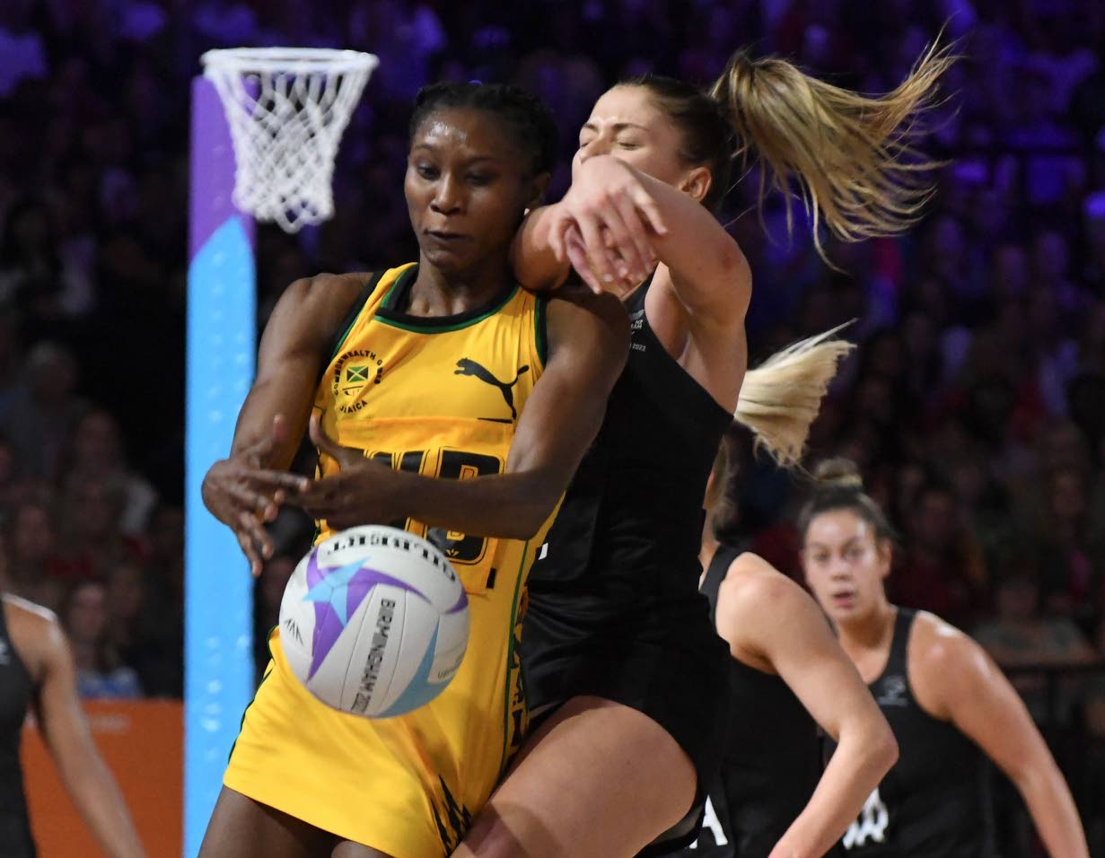Jamaica’s Jodi -Ann Ward (left) battles New Zealand’s Whitney Souness in the netball semi-final match during the Commonwealth Games in Birmingham, England, on August 6, 2022. Photo: Naphtali Junior