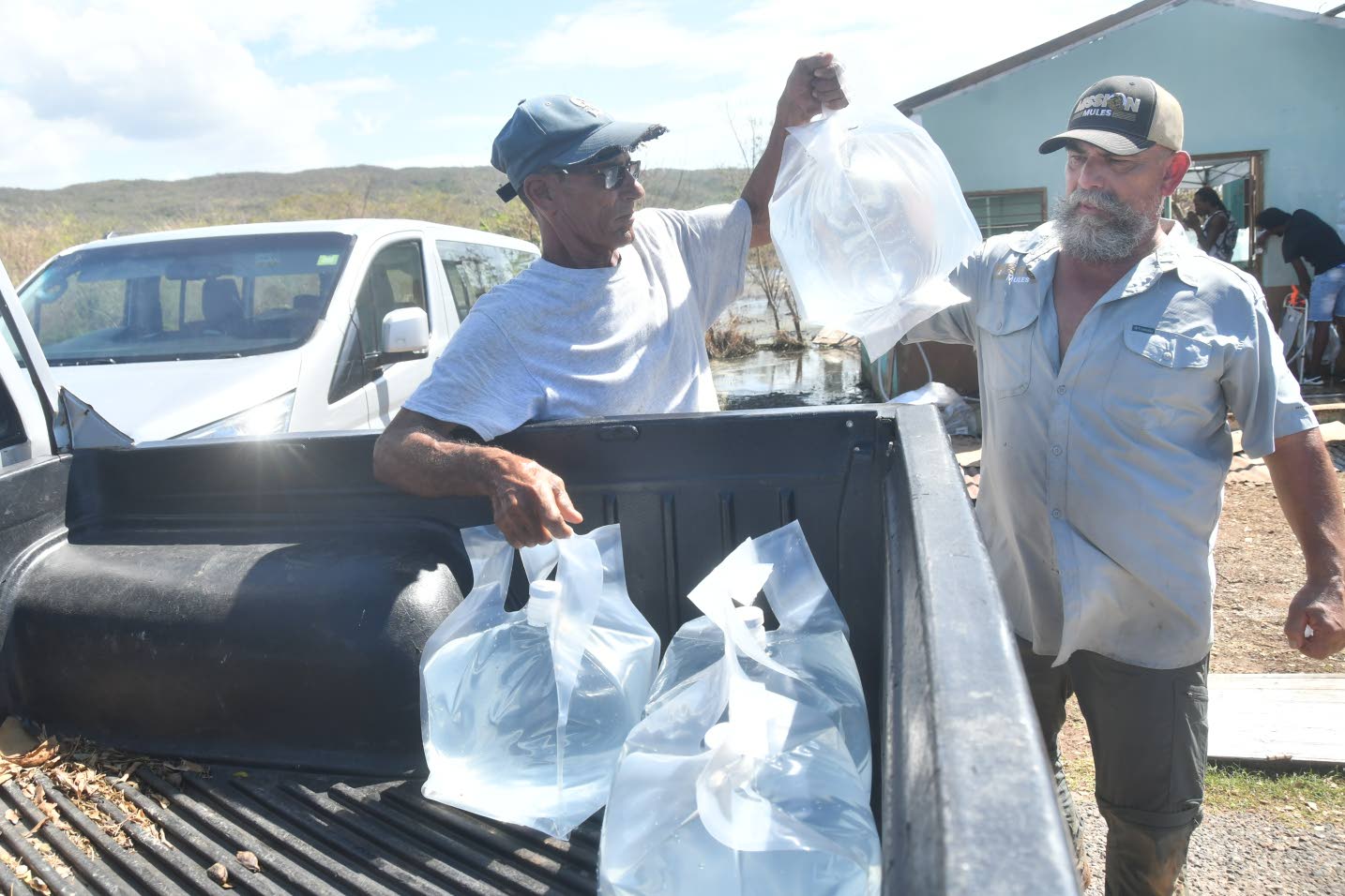 Hanif Forrest (left), a resident of Great Bay, and John Wright from Katadyn, load bags of water into a pick up truck in Great Bay near Treasure Beach in St Elizabeth on Sunday. Garfield Robinson