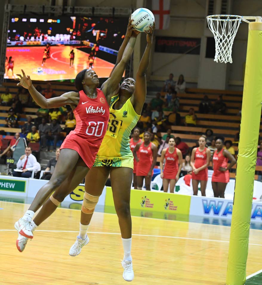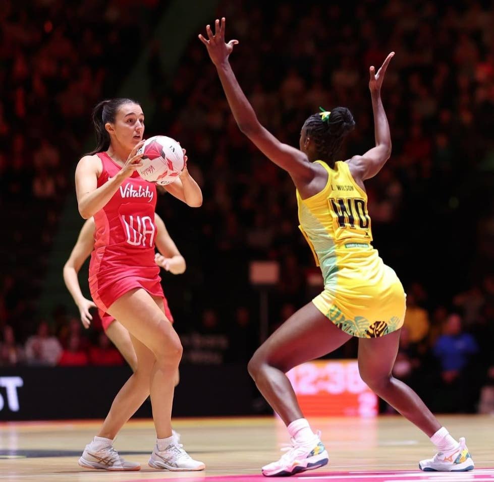 Jamaica’s Latanya Wilson (right) tries to disrupt England’s play during the first game of the Horizon series at the OA Arena in Manchester, England, November 17, 2024.