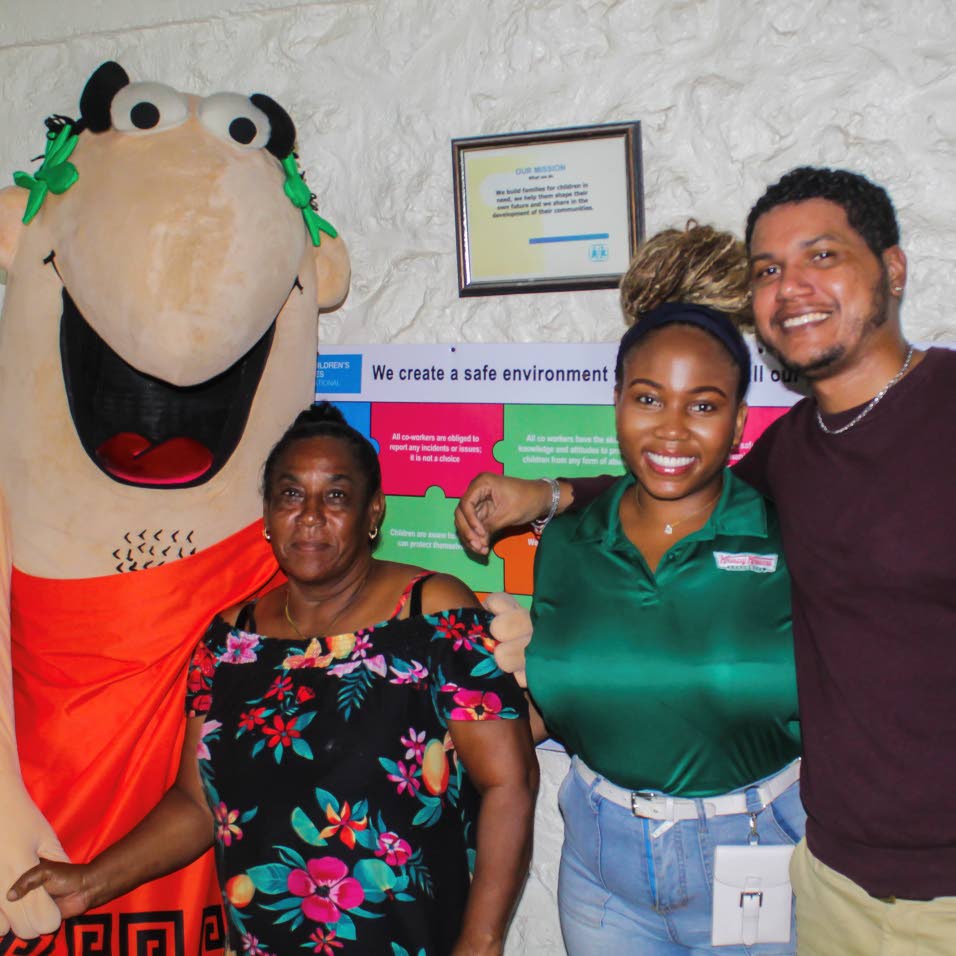 From left: Tilman, the Little Caesars mascot; Marica Spencer, caregiver at the SOS Children’s Village in Barrett Town, Montego Bay; Rashai Graham, Restaurant Associates Limited communications, community and strategy executive; and Sean Patrick, fund development and communications advisor for the SOS Children’s Villages, Jamaica, are photographed as they celebrate the joining of the two SOS Village residents at the Stony Hill location.