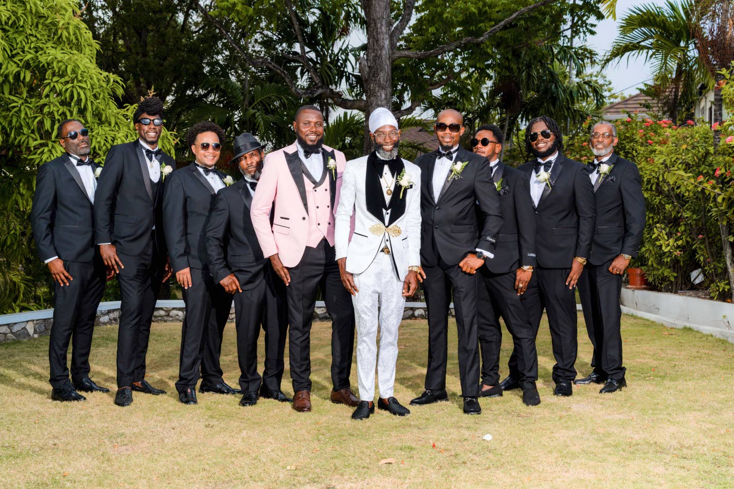 Kevin (centre) shares a moment with his groomsmen (from left) Kedron Miller, Rashaan Bailey, Rojay Barnes, Christopher Richards, best man Gregory Richards, Estrada Lamathe, Kevon Betton, Clive Heron Jr and Ricardo Richards.