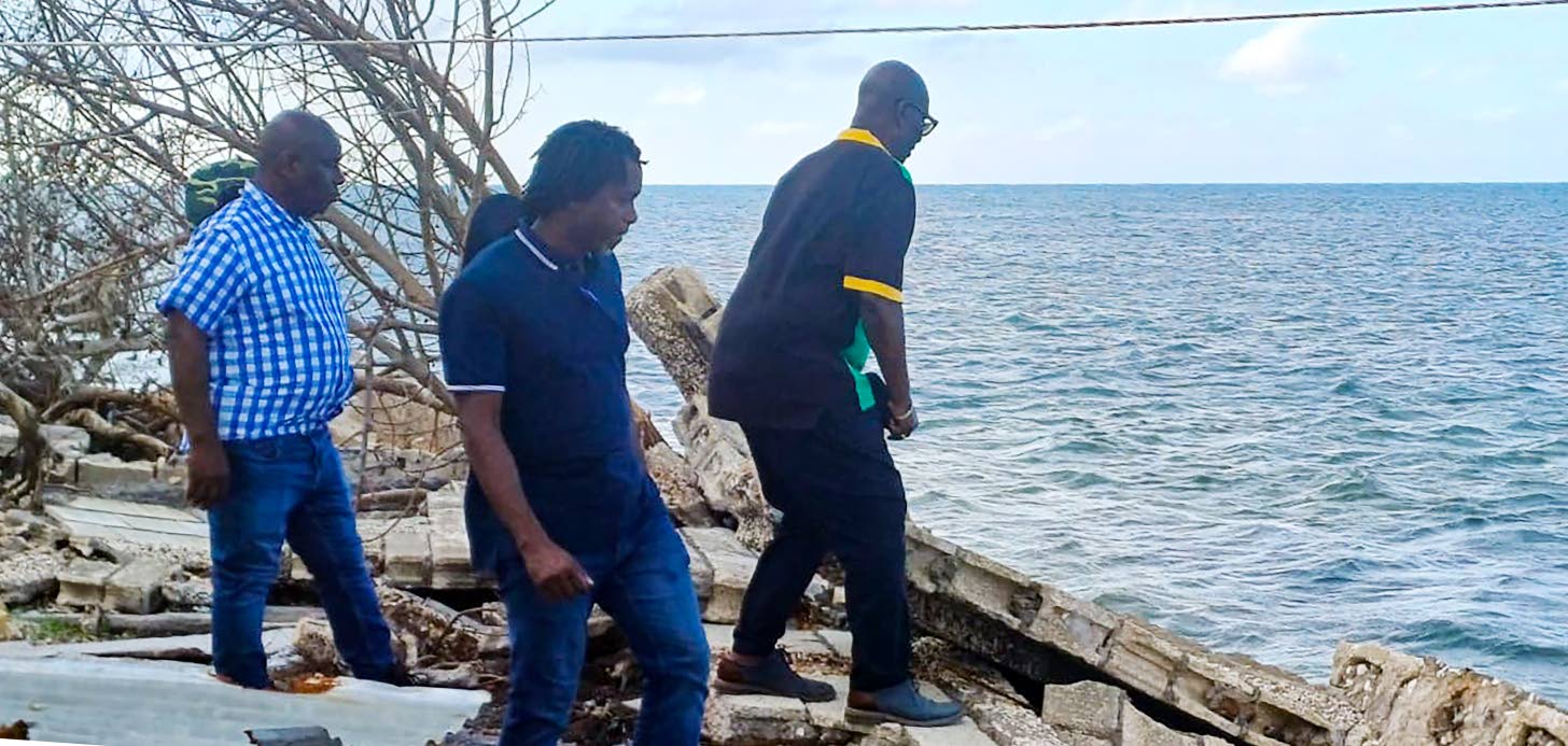 Local Government Minister Desmond McKenzie (right) surveys the broken down seawall at the premises of the Trelawny Infirmary in Falmouth after Melissa. Looking on are Mayor of Falmouth Councillor C Junior Gager (left) and Kayon Hall, superintendent of roads and works at the Trelawny Municipal Corporation. (Photo: Horace Hines)
