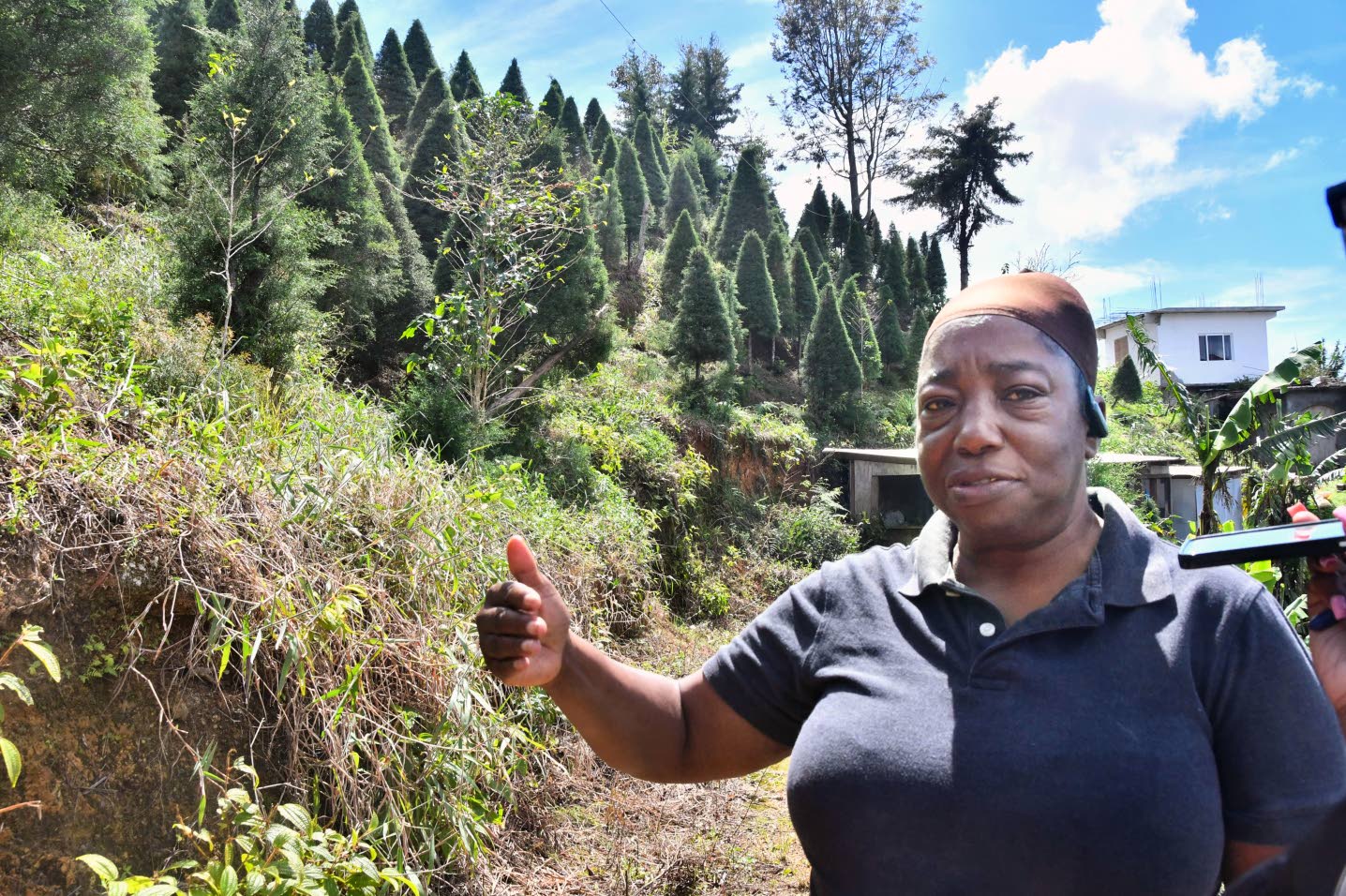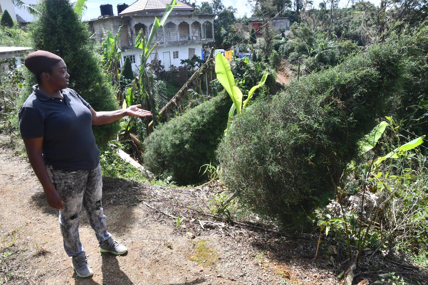 Louis Watson, one of the owners of Watson’s Christmas Trees, pointing to trees left leaning by the winds associated with Hurricane Melissa in her backyard in Penlyne Castle.