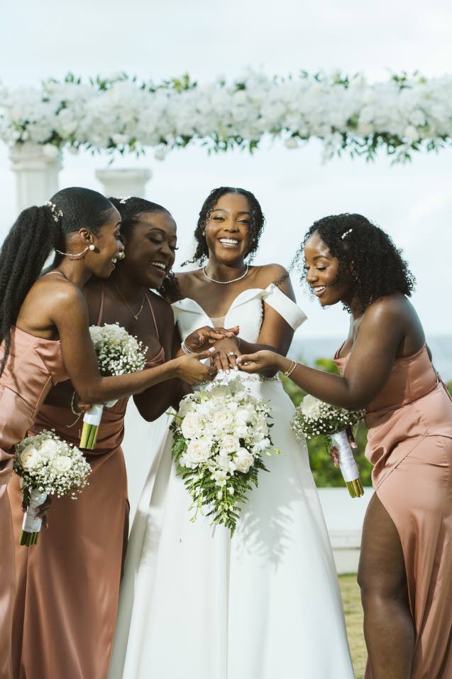 Demesha shows off her wedding ring to her bridesmaids (from left) Rosalee Rosedam, maid of honour ChrisAnn Anderson and Danielle Hamilton. (Photo: J Royal Productions)