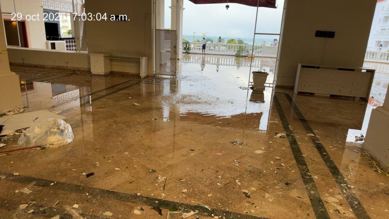 Part of Bahia Principe’s lobby area flooded and strewn with debris in the hours after Hurricane Melissa, one of several interior spaces Guerra says requires extensive repair..