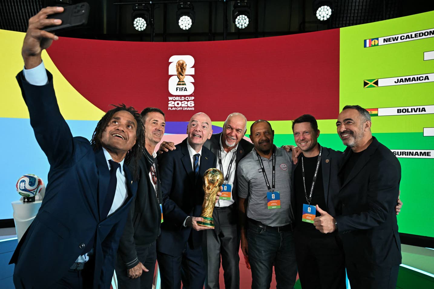 French former player Christian Karembeu takes a selfie with (from third left) FIFA President Gianni Infantino, President of the Caledonian Football Federation Gilles Tavergeux, member of the Caledonian Football Federation Patrice Mandaoue, New Caledonia’s coach Johann Sidaner and former French football player Youri Djorkaef after the 2026 FIFA World Cup European Play-Off draw at the FIFA’s Home of Football in Zurich on Thursday. (Photo: AFP)
