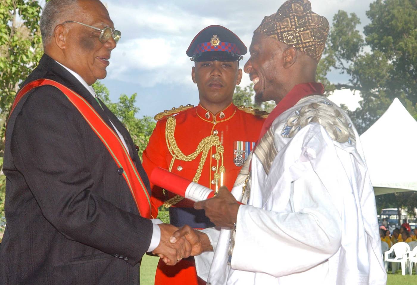 Jamaican music icon Jimmy Cliff (right) is vested with the Order of Merit, Jamaica’s third-highest national honour, at the National Honours and Awards Ceremony in October 2003 by then Governor General Sir Howard Cooke.