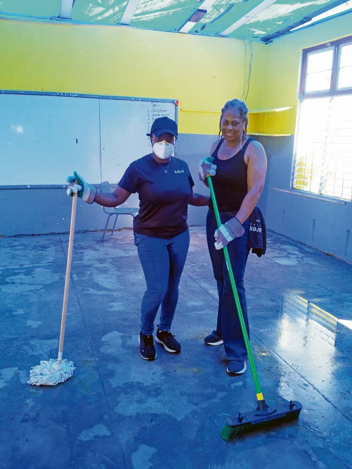 Allamish Creightney (left), sales manager – Kingston, Kia Jamaica, and Shaunette Swaby-McDonald, sales manager – Montego Bay, Kia Jamaica, assist in clean-up efforts at King’s Primary & Infant School in Westmoreland. (Photo: Rory Daley)
