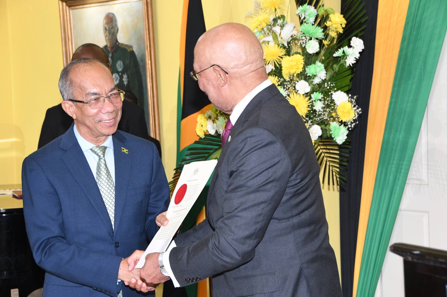 National Security and Peace Minister Dr Horace Chang (left) is presented with the instrument of office by Governor General Sir Patrick Allen at King’s House. (Photo: Joseph Wellington)