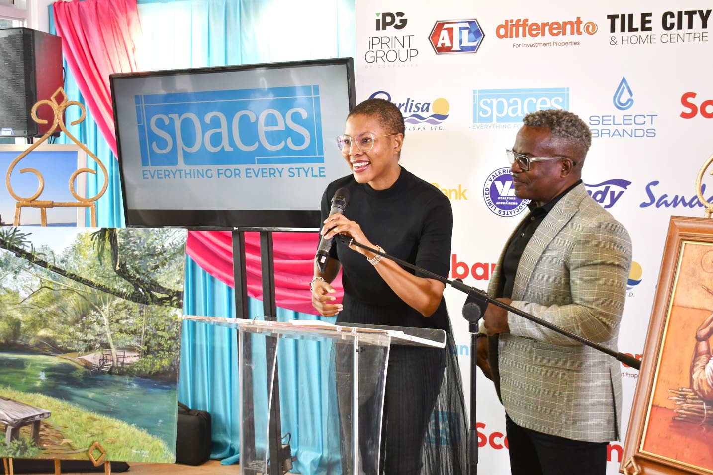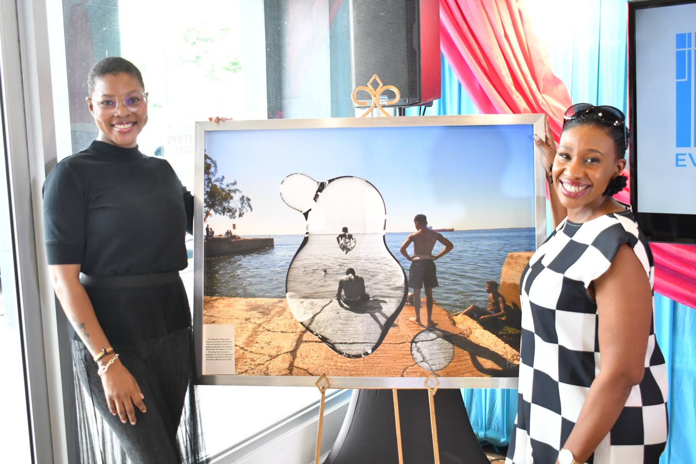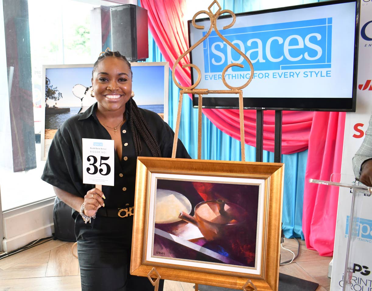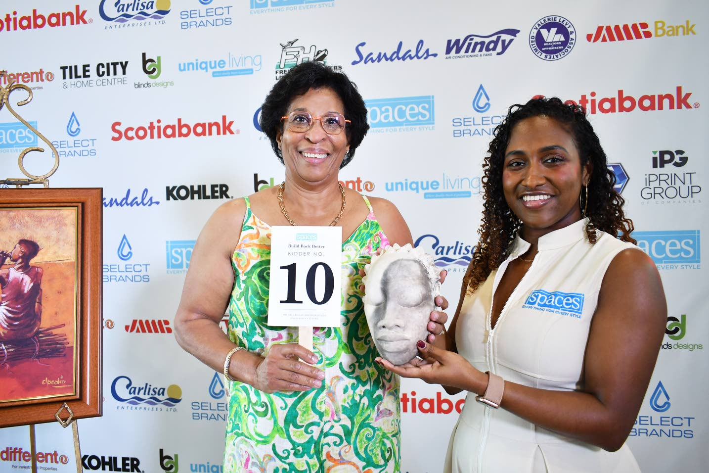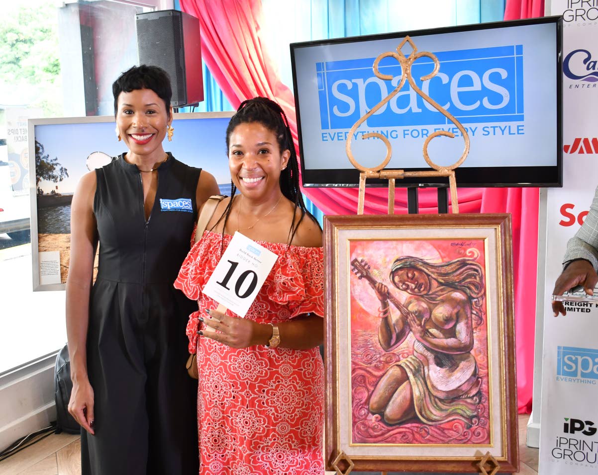 Spaces Jamaica Marketing Officer Toni Hibbert (left) shared the frame with bidder #10, Dr Toni Barnes, who secured Woman Playing Guitar by Jamaican fine artist Owen Beckford. (Photo: Karl Mclarty)