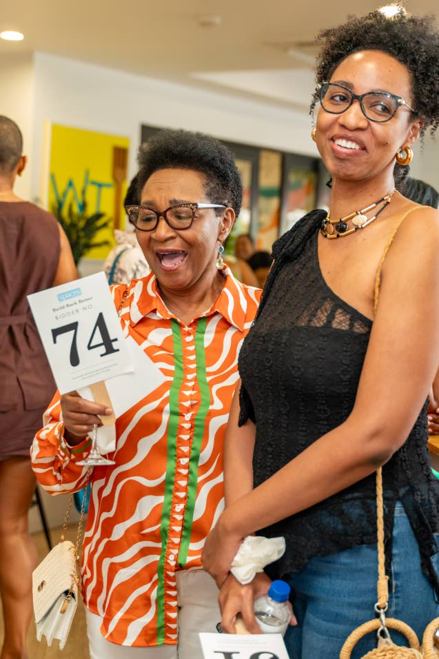 Visual artist Kianne Patrice Hutchinson (left) celebrated with Dr Suzanne McDonald-Fowles, moments after McDonald-Fowles successfully bid on Hutchinson’s work, The Waterfront Boys. (Photo: Karl Mclarty)
