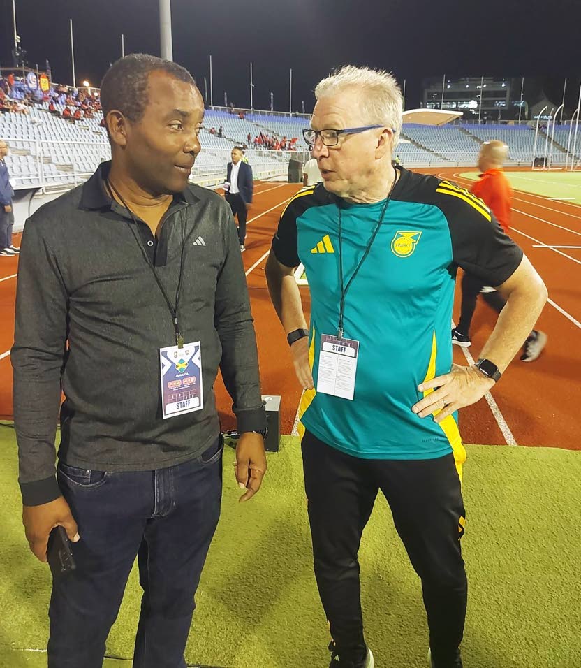 Newly appointed Jamaica senior men’s football team interim head Coach Rudolph Speid (left) with predecessor Steve McClaren, to whom he served as a technical advisor, while at the Hasely Crawford Stadium in Port of Spain, Trinidad, for their FIFA World Cup qualifier against the hosts on Thursday, November 13. McClaren quit as head coach after successive draws in this game and against Curaçao days later, which denied the Reggae Boyz automatic qualification. (Photo: Garfield Robinson)