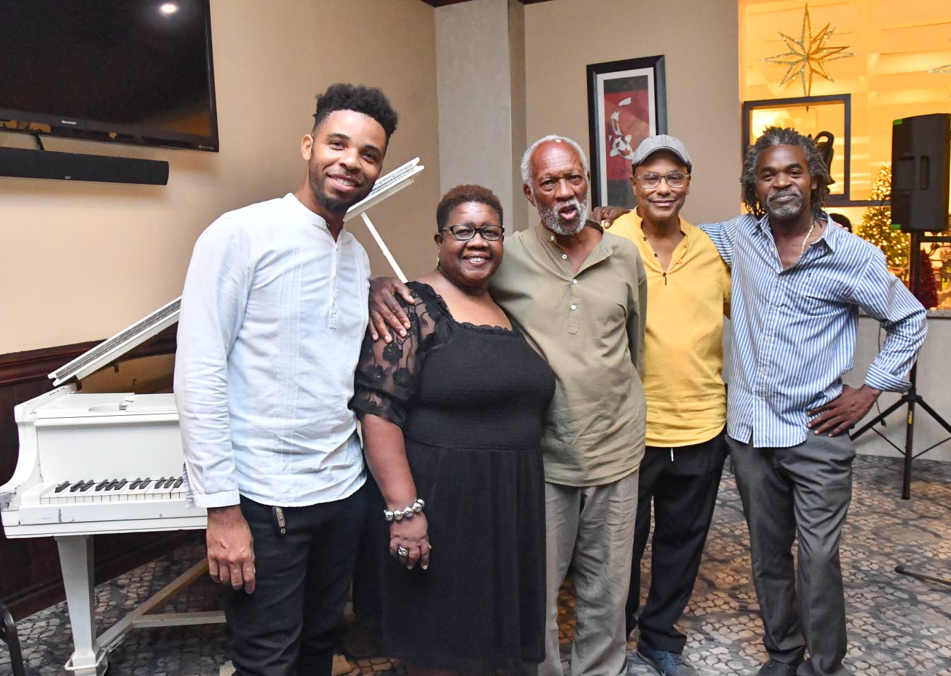 A Chord Well Struck Event conceptualiser Herbie Miller (centre) shared a moment with (from left) percussionist Clayon Samuels, vocalist Sandra Crawford, pianist Orville Hammond, and bass player Leon Duncan. Naphtali Junior