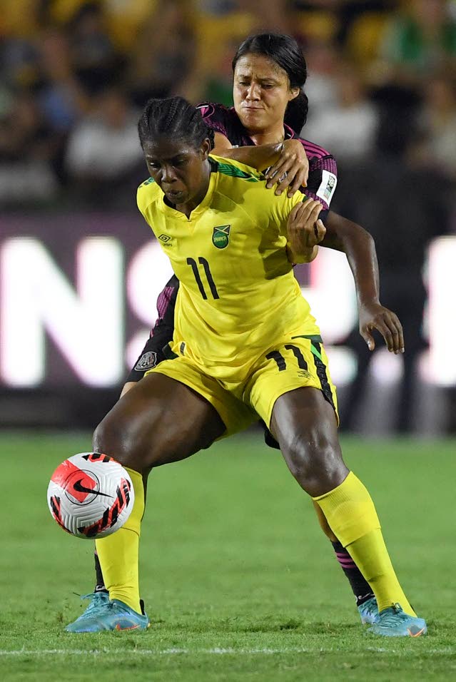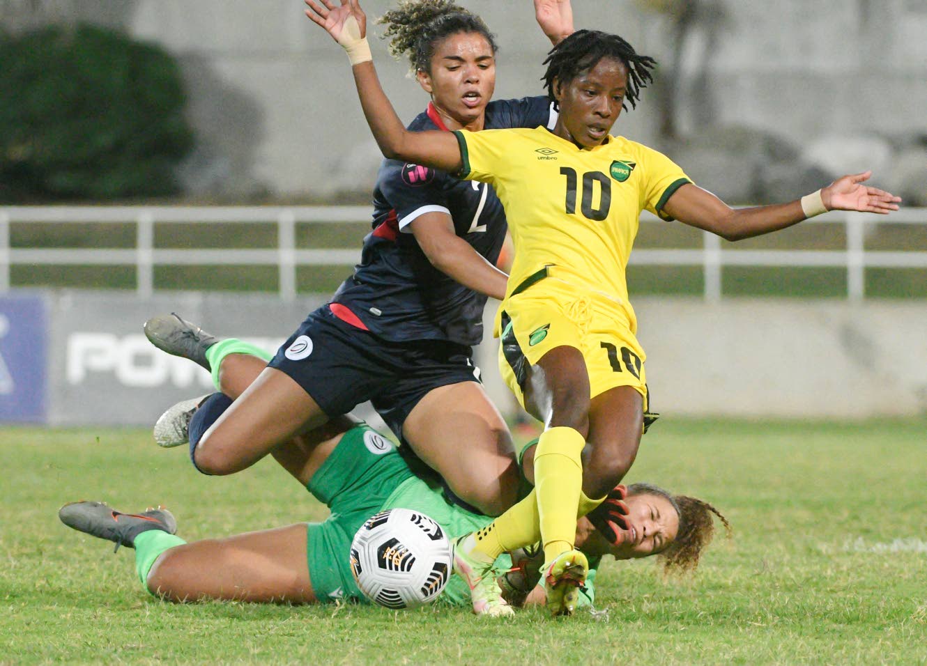 In this April 12, 2022 file photo, Jamaica’s Jody Brown (foreground) gets the ball ahead of Dominican Republic defender Giovanna Dionicio during the Women’s World Cup qualifying Group C contest at Sabina Park in Kingston. (Photo: Naphtali Junior)