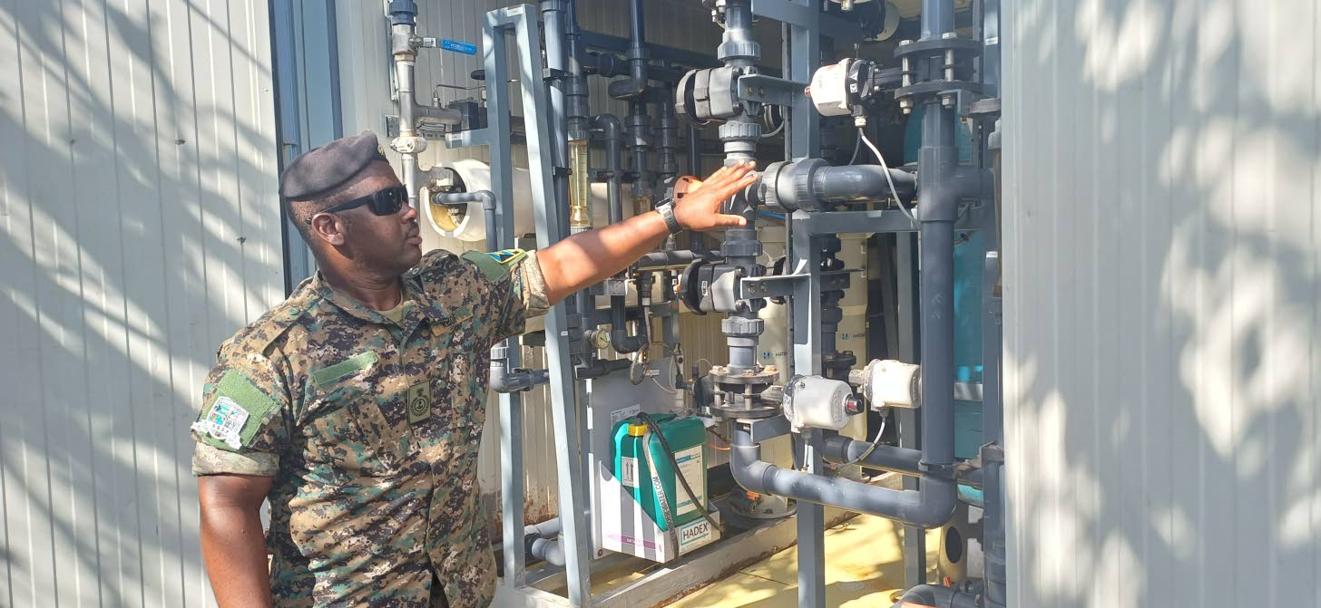 Chief Petty Officer Shavargo Green of the Royal Bahamas Defence Force operating the reverse osmosis plant at the Falmouth Pier Monday.