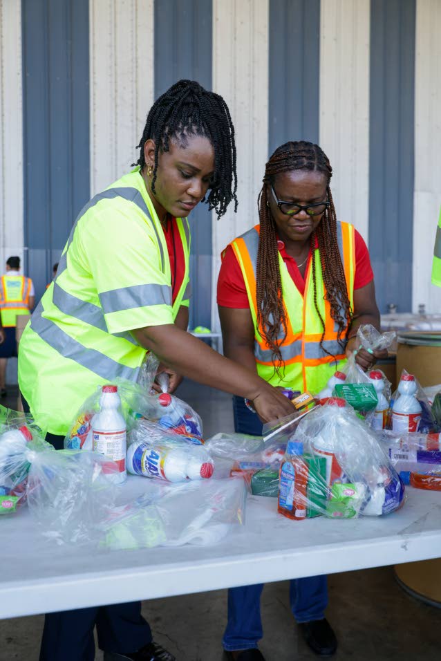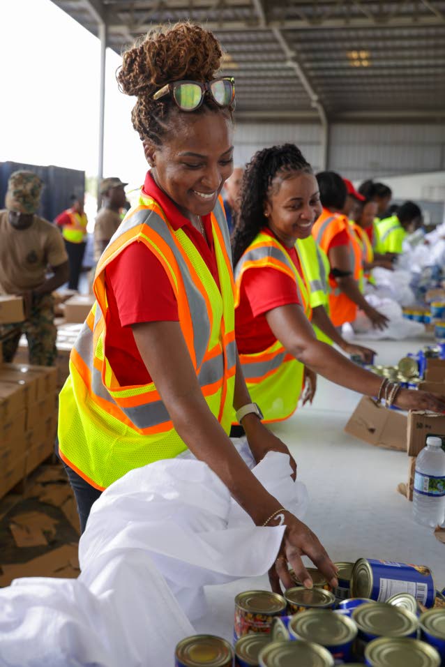 From left: Scotiabank’s Yanique Forbes-Patrick regional director, Caribbean corporate affairs; and Georgette Dallas, manager, occupational health and safety, serve with a smile. Every item packed brings relief and hope..