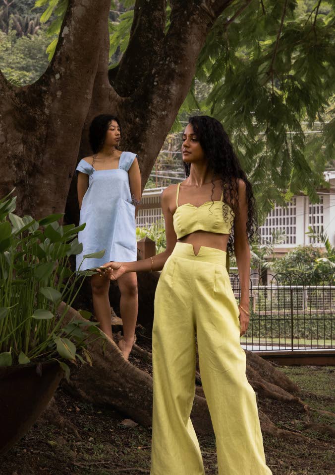 Savannah Garden Dress (left) and FERN Crop Bralette paired with MEADOW V Waist Classic Trousers(Photo: Jordan LHR | The Perspectivs)