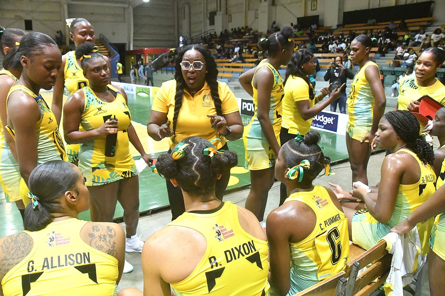 Head Coach Sasher-Gaye Henry-Wright (centre) talks to Jamaica’s senior Sunshine Girls during a match against the All-Star Mixed Team at the National Indoor Indoor Sports Centre on December 5, 2025. (Photos: Garfield Robinson)