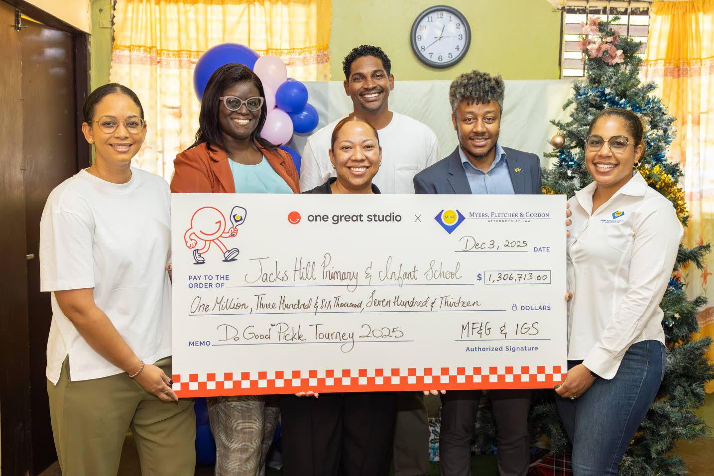 Ayodele Taylor-McDonald (2nd left), principal, and Jermaine Nairne (2nd right), chairman of Jacks Hill Primary and Infant School receive a $1.3 million donation from Gina DeLisser (left), chief operations officer; Robynn Lee, business development officer, and Djuvane Browne, chief executive officer of One Great Studio, alongside Shaniel May Brown (right), partner at Myers, Fletcher & Gordon.
