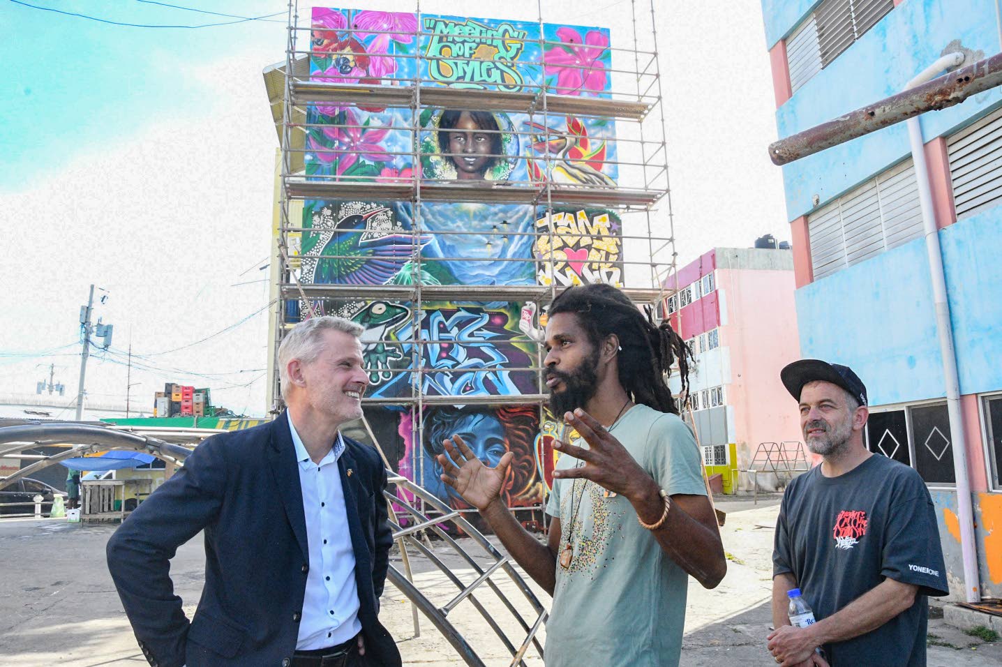 One of the giant murals in Tivoli Gardens forms an impressive backdrop as German Ambassador to Jamaica Jan Hendrik Van Thiel (left) discusses the Tivoli Mural Project with O’Neil Coke, one of the main organisers of the project, while Manuel Gerullis, founder of Meeting of Styles, looks on during a tour of the project by diplomats on Monday. (Photo: Joseph Wellington)