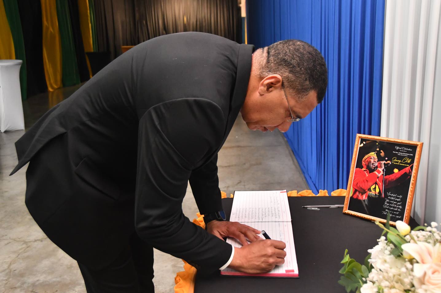 Prime Minister Andrew Holness signs the memorial book at the official funeral service for reggae legend Jimmy Cliff Wednesday (Photo: Naphtali Junior)