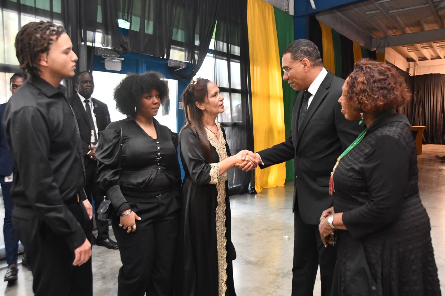 Prime Minister Andrew Holness (2nd right) and Cultute and Entertainment Minister Olivia Grange (right) greet Jimmy Cliff’s family members, from left, son Aken Cliff, daugher Lilty Cliff and widow Latifa Chambers at the legend’s official funeral service Wednesday. (Photo: Naphtali Junior)
