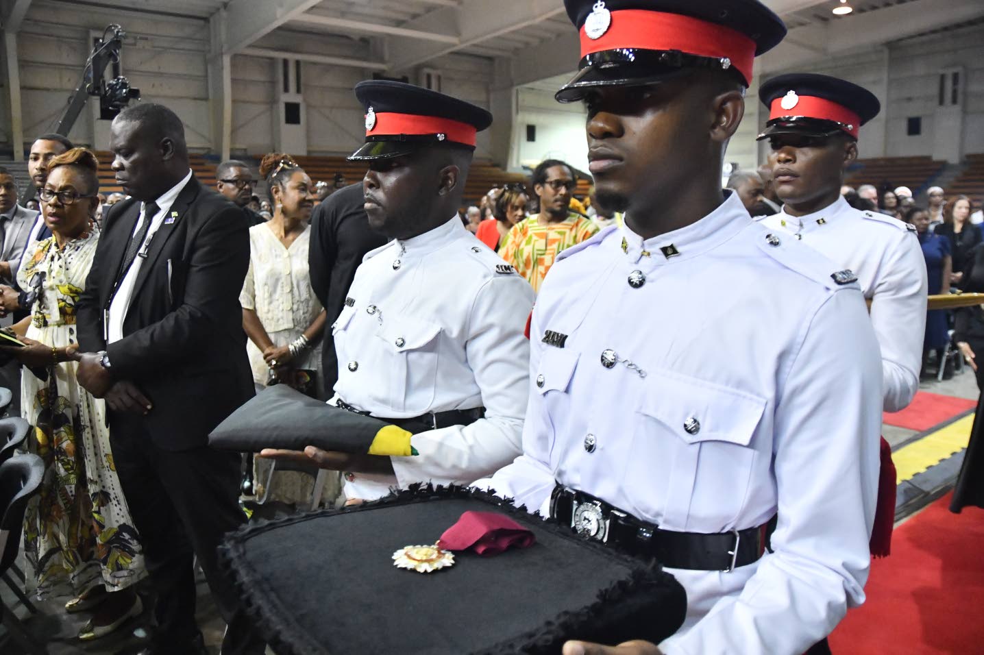 Jimmy Cliff’s Order of Merit and the Jamaican flag being taken into the service celebrating his life at the National Indoor Sports Complex Wednesday (Photo: Naphtali Junior)