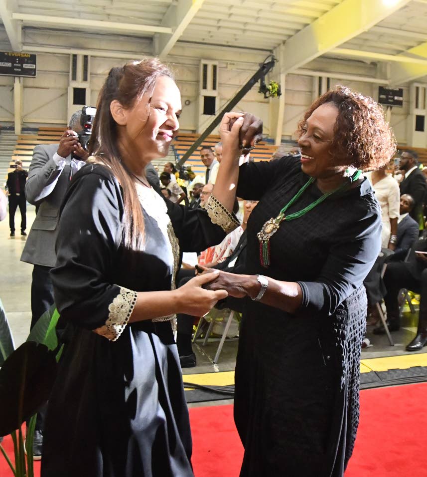 Culture and Entertainment Minister Olivia Grange (rights) greets Jimmy Cliff’s widow Latifa Chambers at his official funeral service at the National Indoor Sports Centre Wednesday. (Photo: Naphtali Junior)